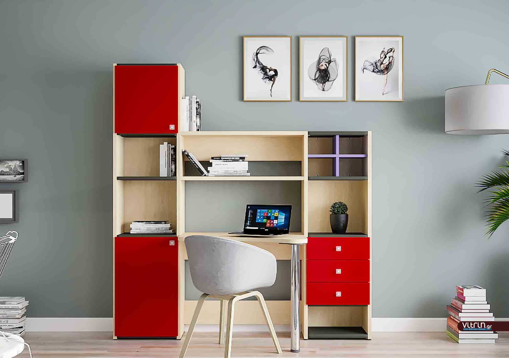 Περιλαμβάνει: Γραφείο με ράφι, 1 βιβλιοθήκη με ντουλάπι και 1 βιβλιοθήκη με 3 συρτάρια.