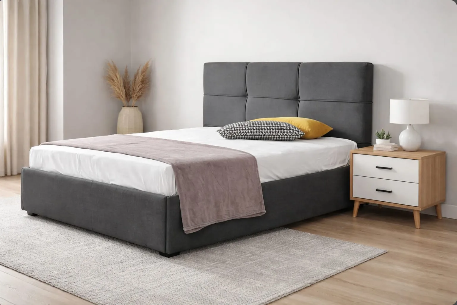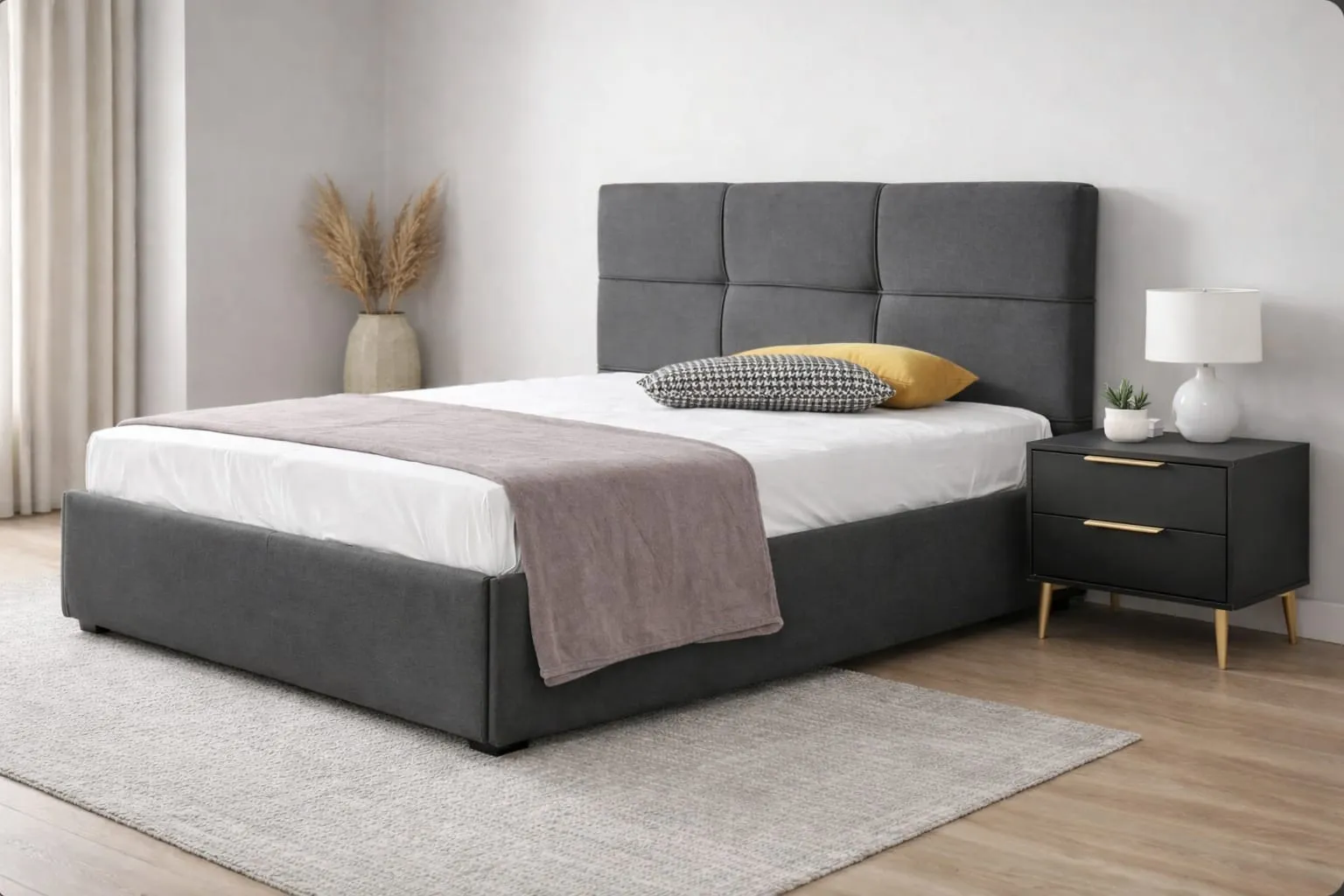 Ένα κομψό και σύγχρονο κρεβάτι με επιβλητικό κεφαλάρι σε γεωμετρικό σχεδιασμό, που προσφέρει άνεση και στιβαρότητα. Ιδανική επιλογή για μοντέρνους χώρους που θέλουν καθαρές γραμμές και διακριτική πολυτέλεια.