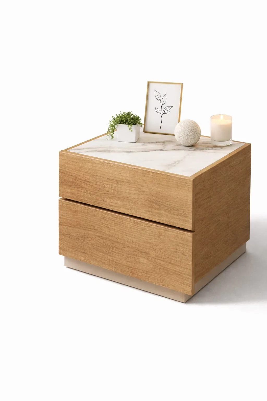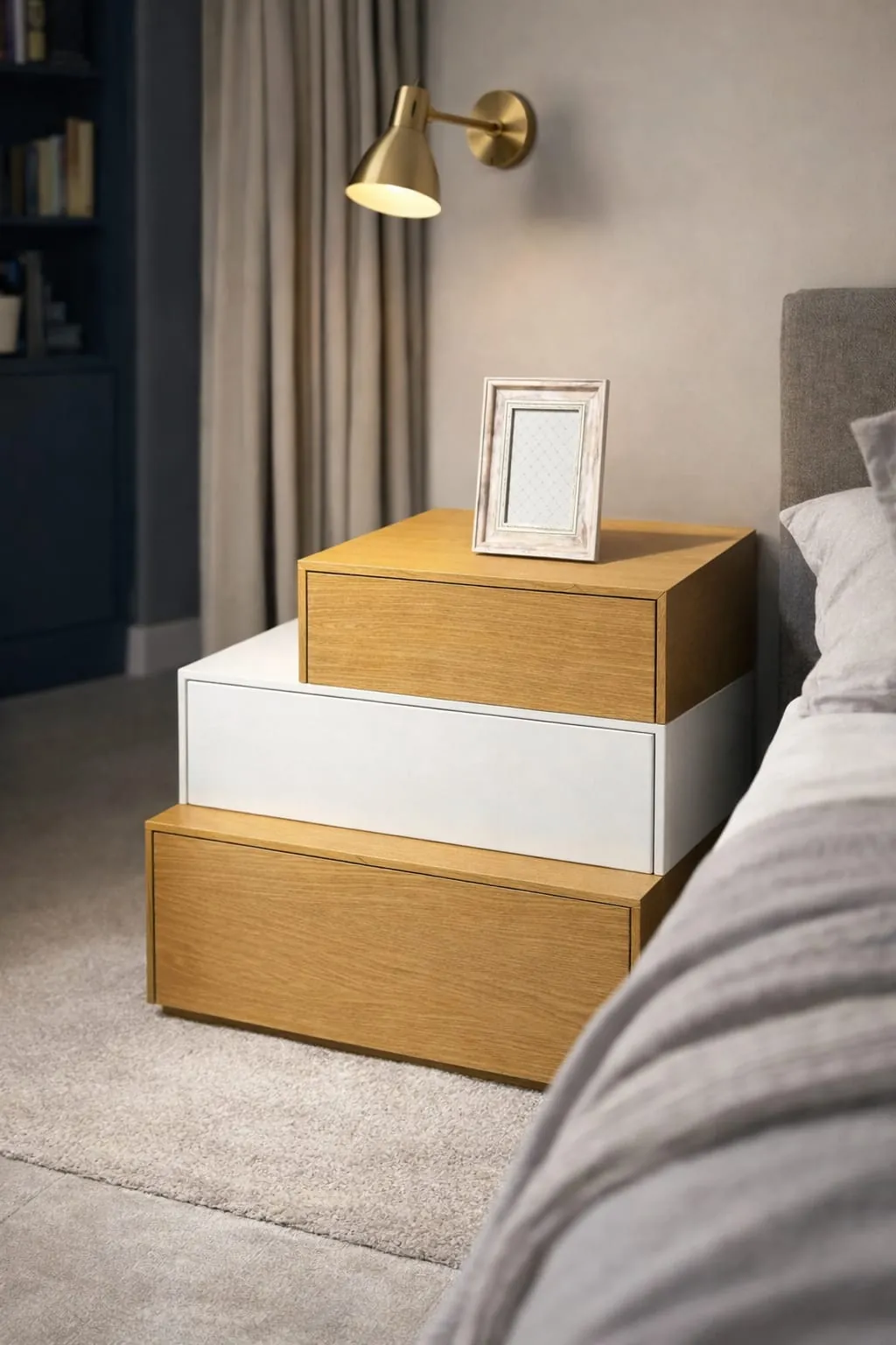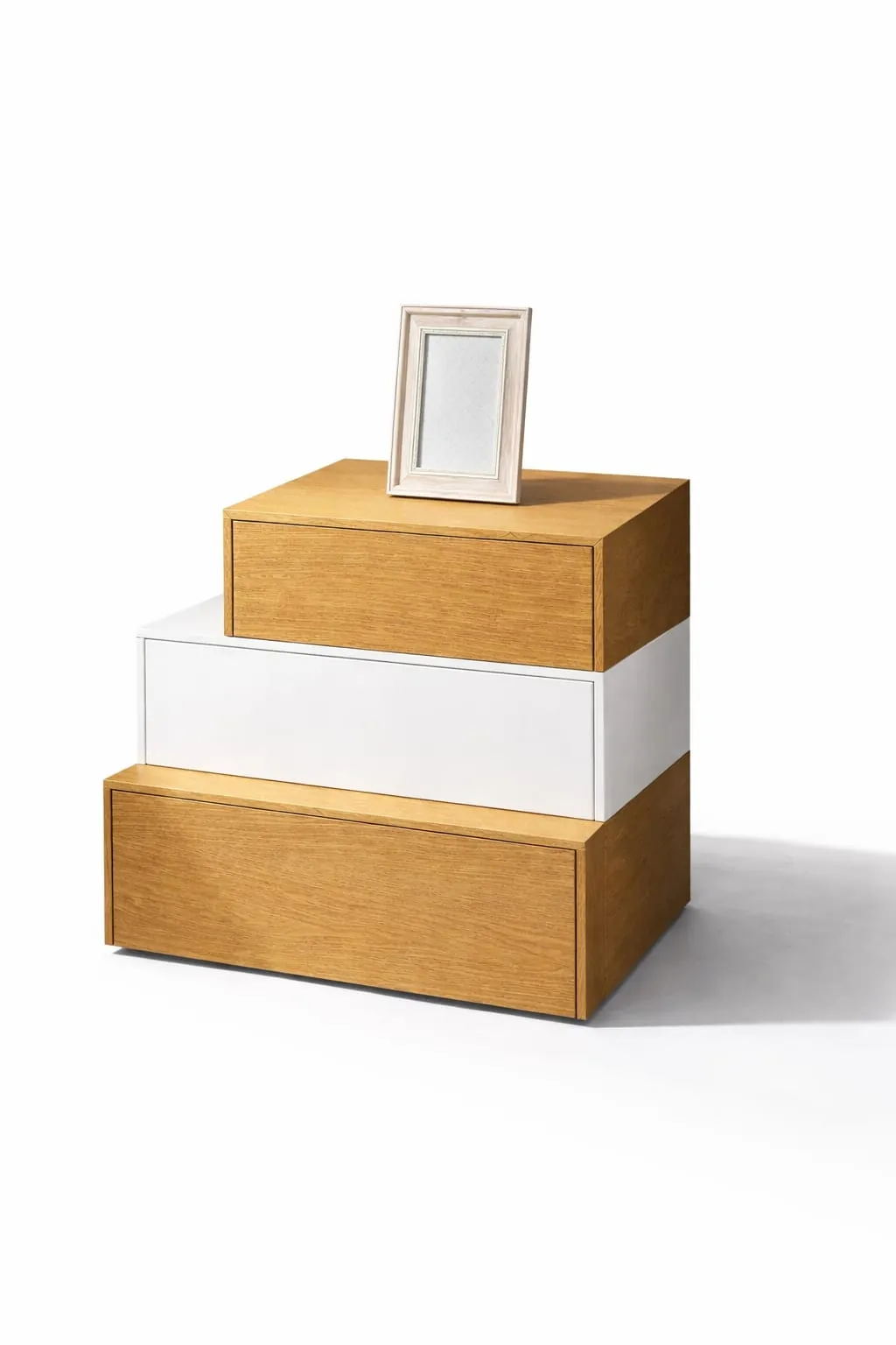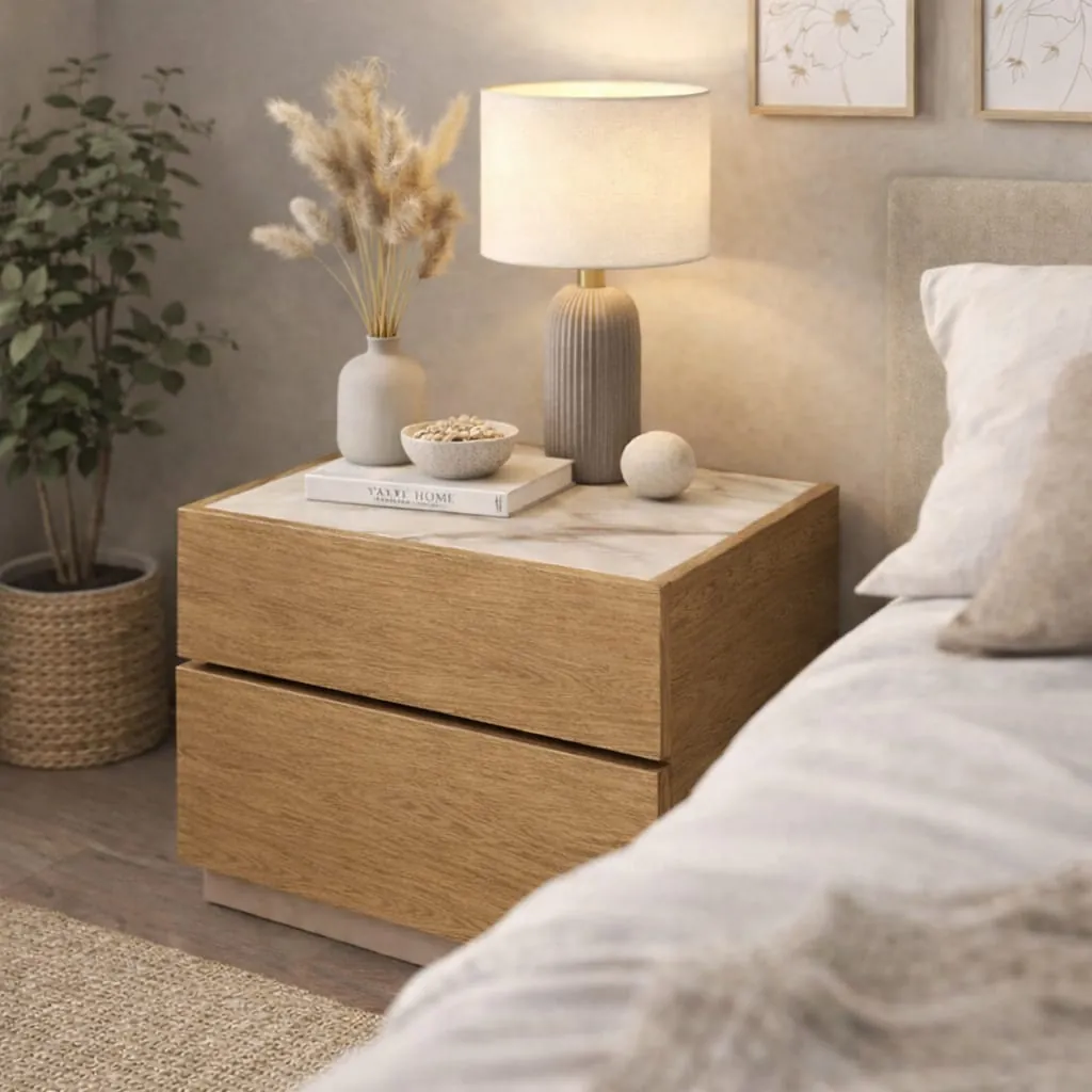 Μοντέρνο κομοδίνο με διχρωμία ξύλου και λευκού που συνδυάζει αισθητική και πρακτικότητα. Διαθέτει ευρύχωρα συρτάρια για αποθήκευση και ταιριάζει ιδανικά σε σύγχρονα υπνοδωμάτια, προσφέροντας κομψότητα και λειτουργικότητα στον χώρο σας.